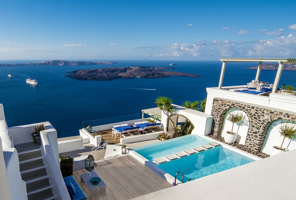 In addition, guests have access to a fitness and massage facility with its own grotto pool, swimming pool including a jetted seating area and a traditional Greek taverna with sky-box views of the caldera. The concierge staff contacts guests ahead of their arrival to plan the stay and provide bespoke assistance to ensure a seamless experience.