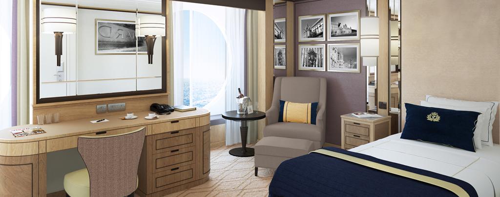 Of the 15 Britannia Single staterooms that will be added, nine single cabins will be on Deck 2 and six larger single staterooms will be built on Deck 3L. New single staterooms on port side Deck 2 will benefit from increased ceiling height and an illuminated coffered ceiling. New single staterooms on port side Deck 3L will feature two unique circular windows with bench seat cushions and a central dressing console table.
