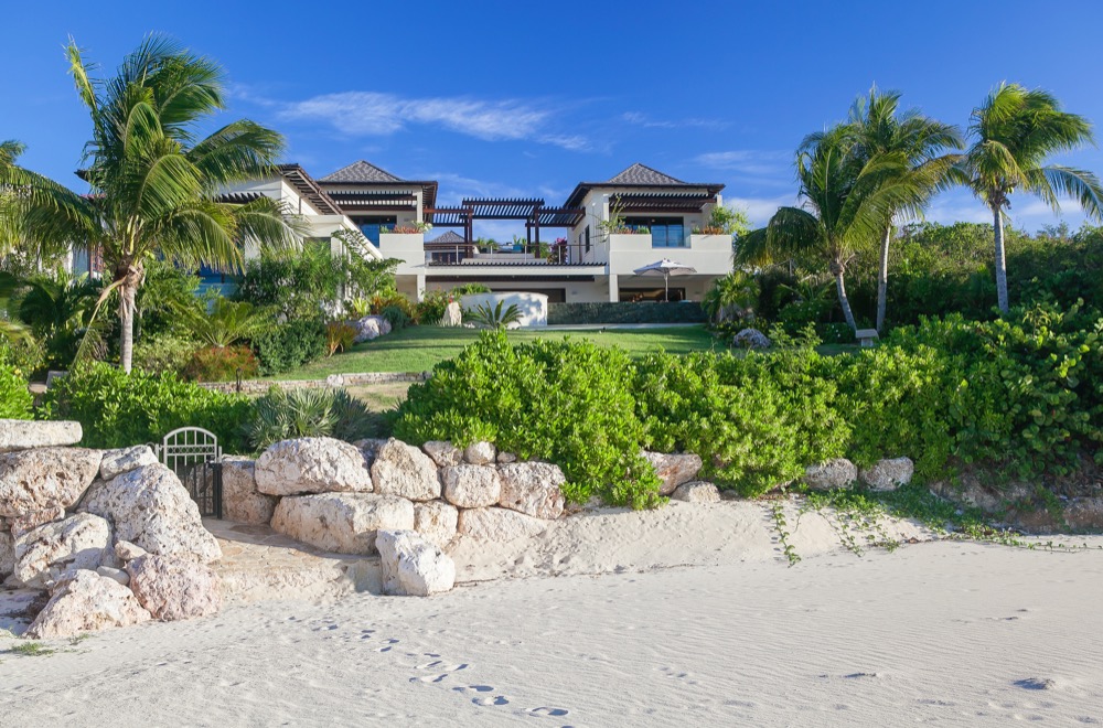 The new property is located in the island’s West End and is set in one acre of landscaped gardens that step down to a half-mile of beach. Five of the bedrooms are in the main house, with three more in a guest house nearby. The second floor of the main house boasts a shaded cocktail deck for sea views.