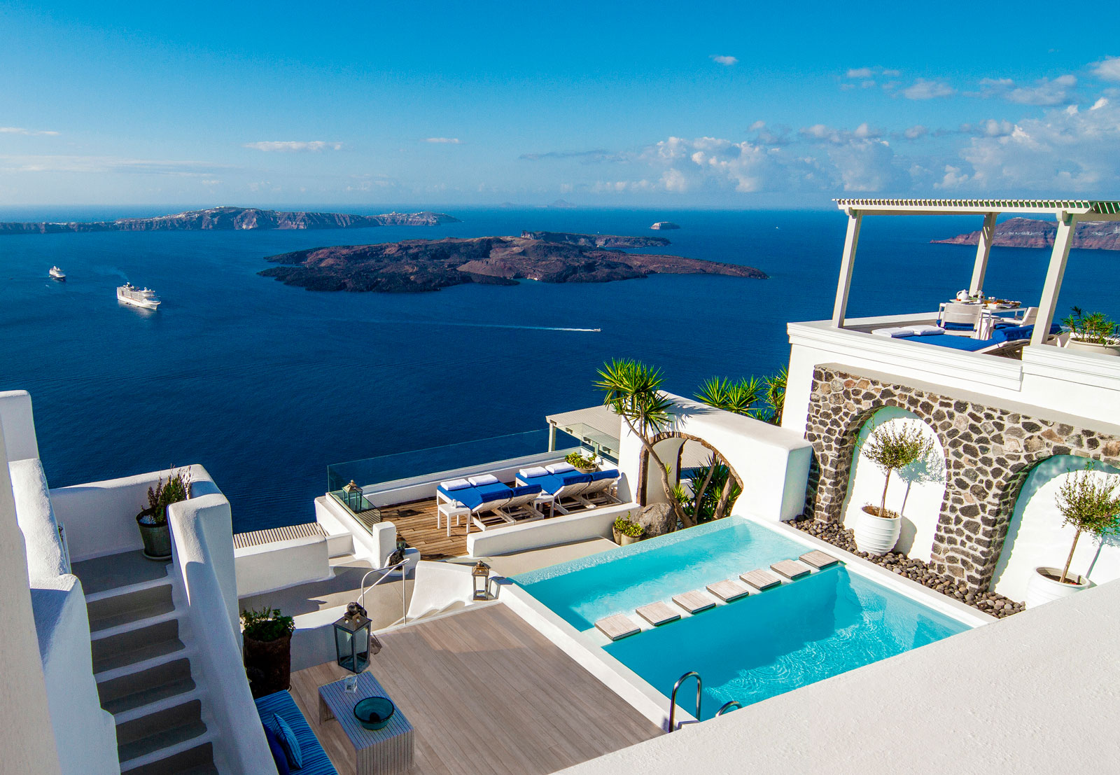 All guests at the hotel have access to a fitness and massage facility with its own grotto pool, a swimming pool with a jetted seating area and a traditional Greek taverna with sky-box views of the caldera and Greek cuisine of the highest level.