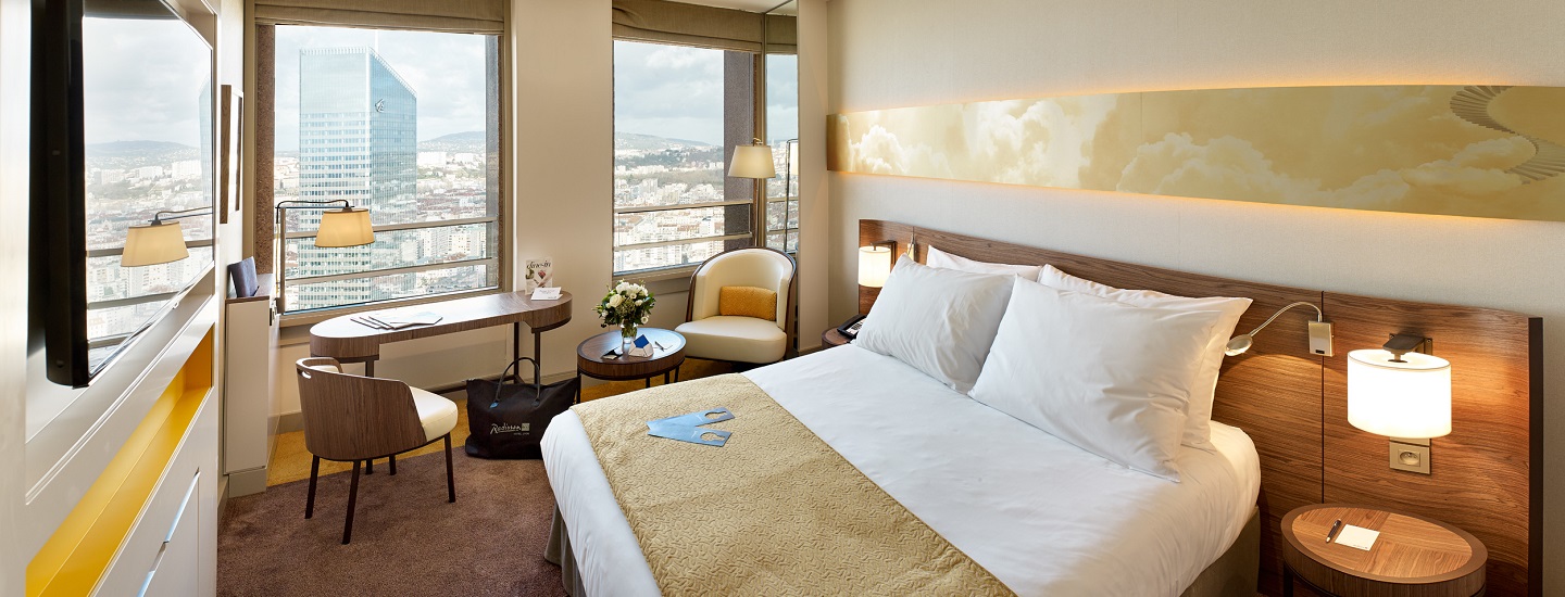 Upon entering the lobby, guests are welcomed by a striking, 18-metre-high light installation, showcasing a stunning atrium under the building’s glass roof. All 245 stylish and modern guest rooms offer superb panoramic views of the city, and provide all of the comforts and technology a guest could need, including free high-speed, wireless Internet. The décor is neutral with colour splashes of violet or saffron and, as a tribute to the history and heritage of the city of Lyon, every room includes a specially woven framed silk.