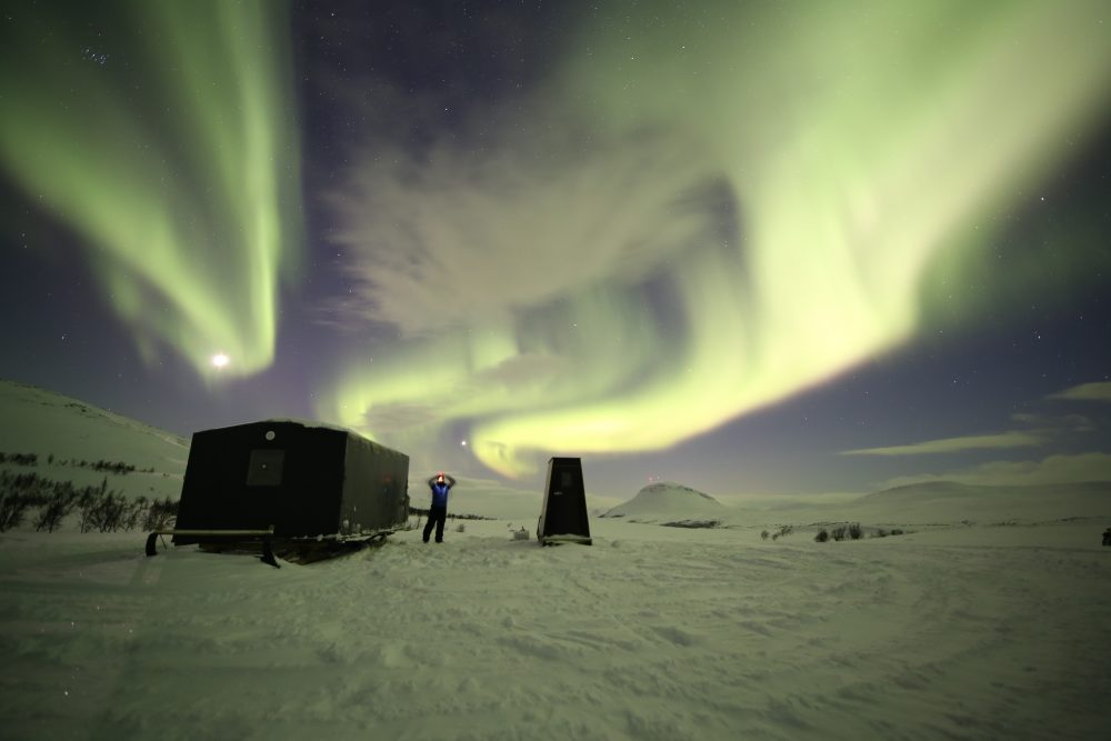 Sleep under the Arctic night sky with a mobile wilderness camp including cabins complete with a clear roof, and see the Northern Lights from the comfort of your wilderness bed. Aurora Wilderness Camp in Kilpisjärvi, Finland, includes two mobile sleeping huts and an Arctic fire, on which guests cook their dinner and learn more about local culture and the Northern Lights from their guide.