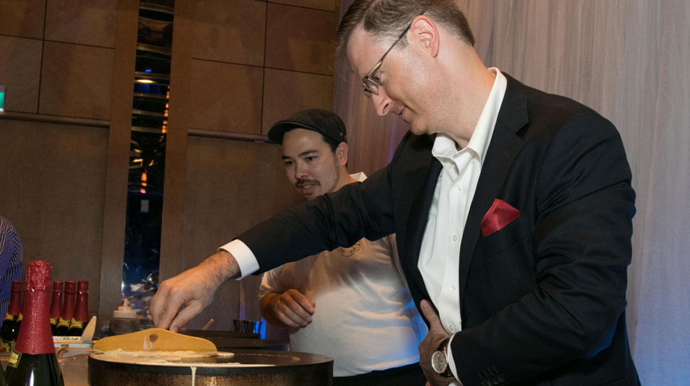 The evening began in a traditional fashion with cider and oysters before guests took their seats at one of three trestle tables lined up under the ballroom’s mirrored ceiling. Jeremy Daunay, distributor of Armorik Whisky in Australia, lead guests through a tasting of three whiskies: the blended Breizh Whisky; the single-malt Armorik Classic and the Armorik Double Naturation, aged in two casks for complexity. Seafood platters, Breton tapas and fish soup followed, accompanied by Kérisac Cider, before a main of cider-braised chicken with apple, potatoes and cauliflower, served family style. Four Frogs Crêperie served up a dessert of traditional crêpes dentelles, complemented by gâteau breton, far breton and kouign-amann.