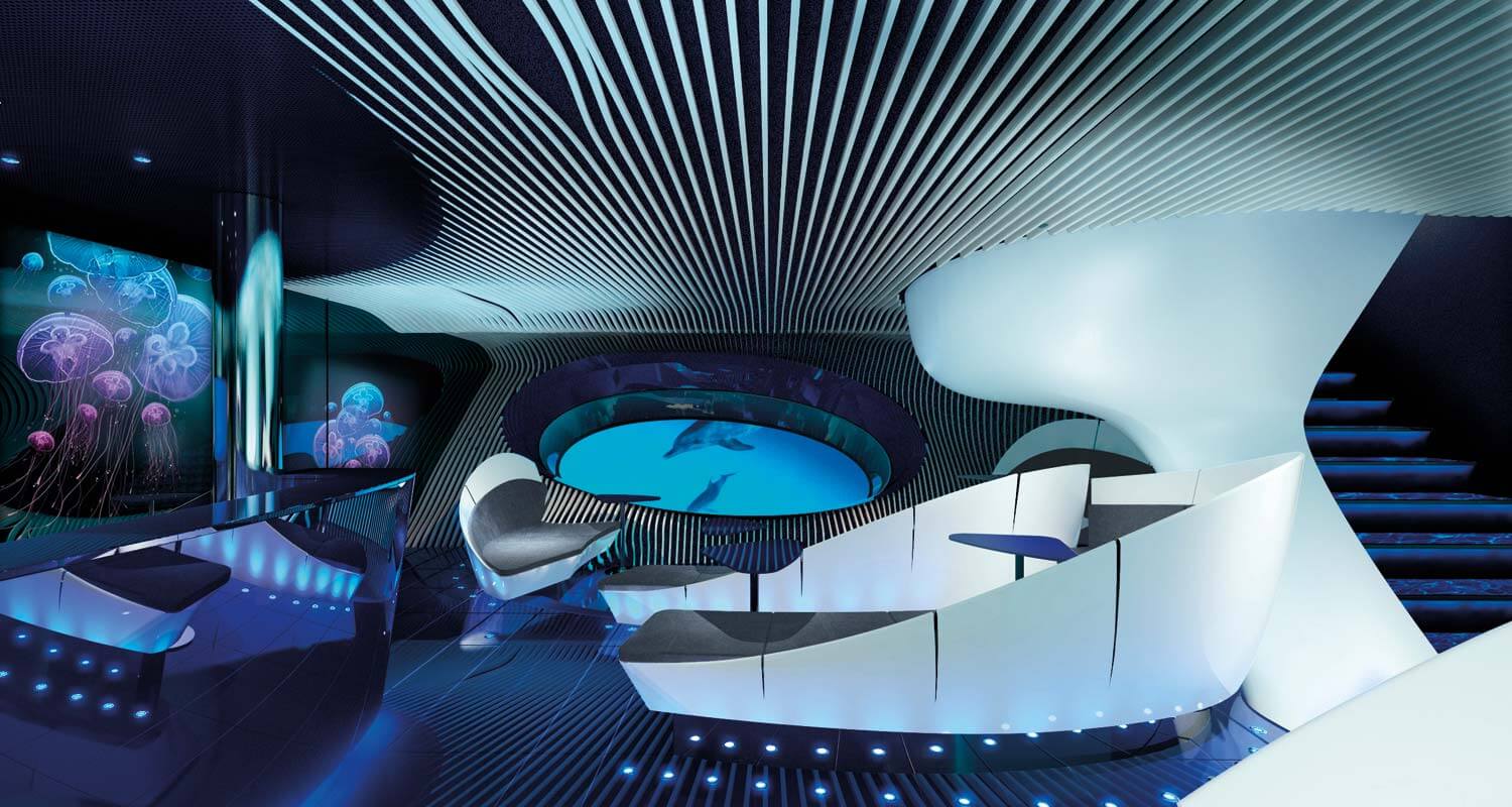 The four new Explorer-class ships (with just 92 suites and staterooms, all with private balcony) will feature a very Jules Verne world first: Blue Eye, a multi-sensory underwater lounge where guests will be able to view the marine environment through glass windows and hear the underwater sounds of marine life while enjoying a martini or glass of champagne.