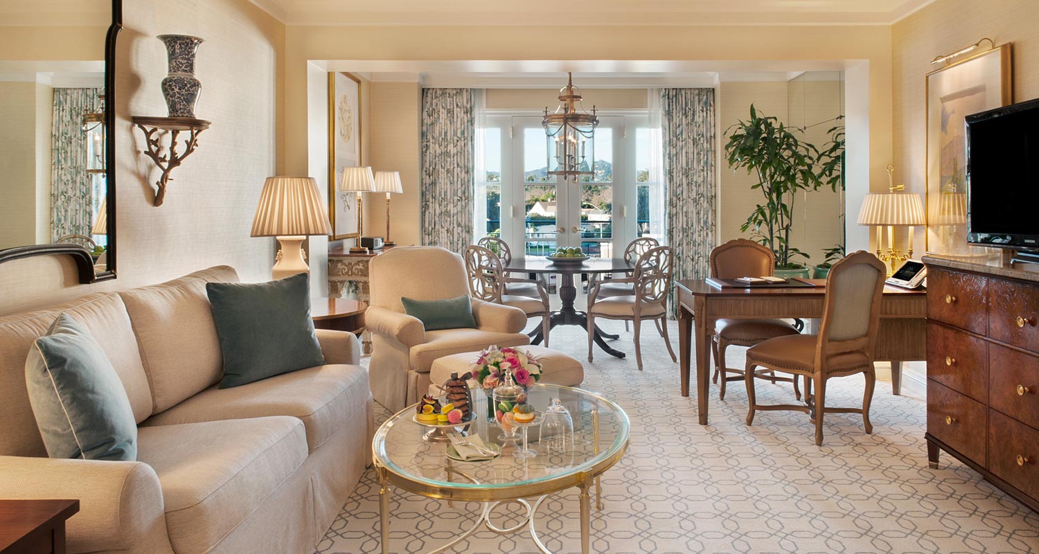 • An aqua, yellow and blue theme welcomes guests staying in the Deluxe Suites, California Suites, Superior Suites and Villas, with the window and canopy bed dressings featuring large-scale prints of botanicals and pineapples, the international symbol of hospitality.