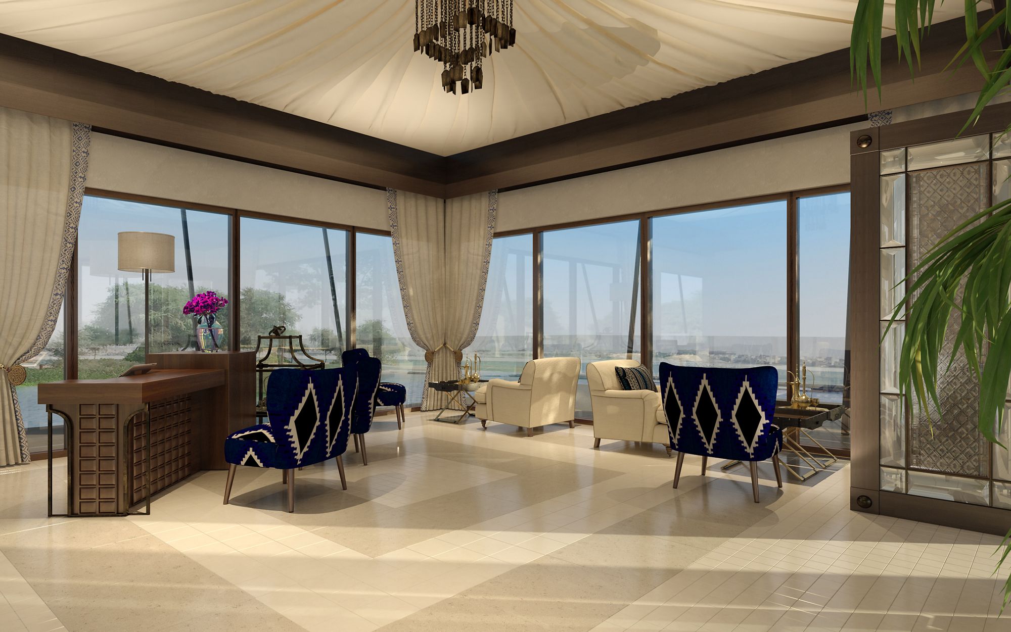 Located on the shores of the Arabian Gulf, just one hour away from the urban metropolis of Dubai, The Ritz-Carlton Ras Al Khaimah, Al Hamra Beach is the perfect getaway, seamlessly blending natural beauty and timeless luxury to create an intimate beach retreat. The resort features 32 luxurious tented villas, each with its own pool and direct beach access. Guests can choose from two types of villas. The Al Naseem Villas feature local design elements inspired by traditional Bedouin architecture and offer an elevated level of seclusion, while the Al Bahar Villas include open views and private beachfront access.