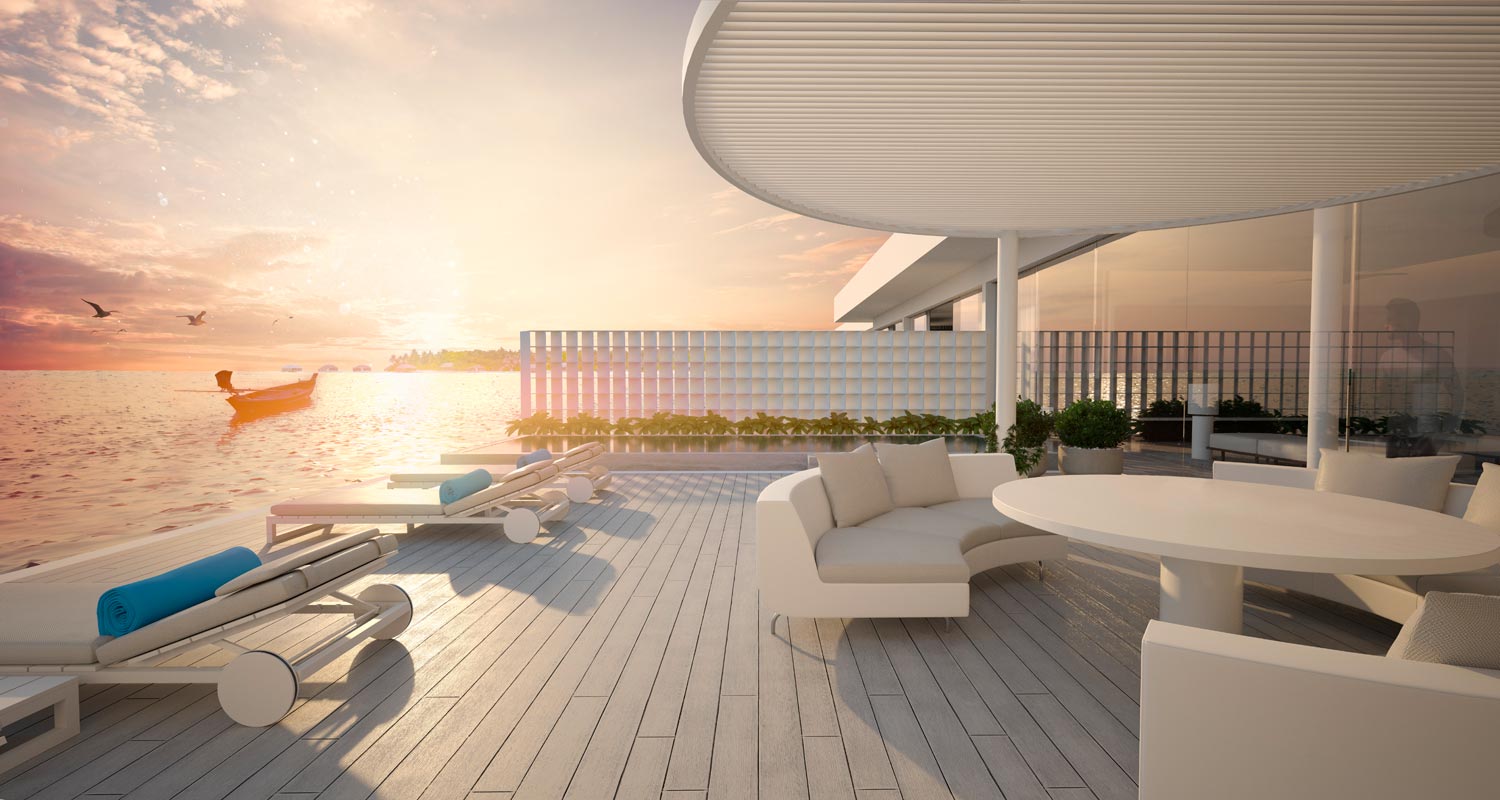 Muraka’s upper level features a twin-size bedroom, bathroom, powder room, gym, butler’s quarters, private security quarters, integrated living room, kitchen, bar and dining, which features a deck that purposely faces the direction of the sunset for optimal viewing pleasure. On the opposite side of the villa sits the relaxation deck that faces the direction of sunrise and is complete with an infinity swimming pool. The upper level also contains an additional king-size bedroom and bathroom, which boasts an ocean-facing bathtub, ideal for soaking in views of the horizon. In total, Muraka can accommodate up to nine guests.