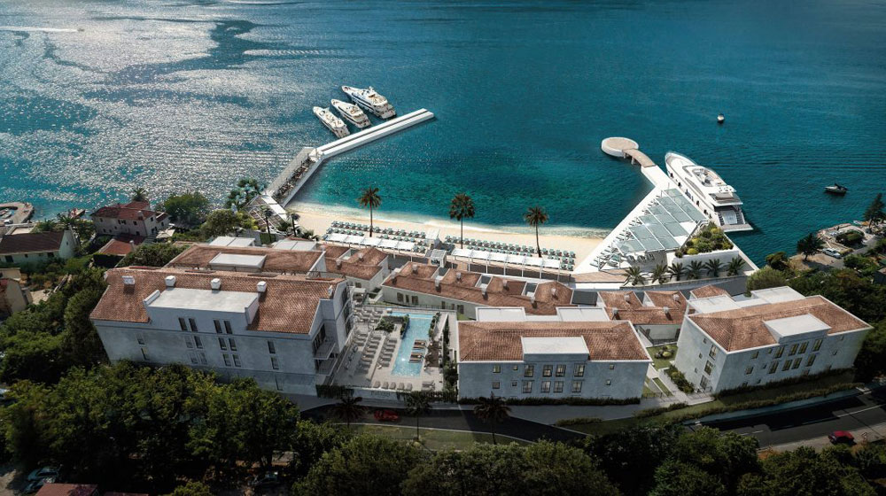 Located in the town of Dobrota, Montenegro, the five-star beachfront property blends architecture and design with its mountainous landscape, offering views of Kotor Bay.