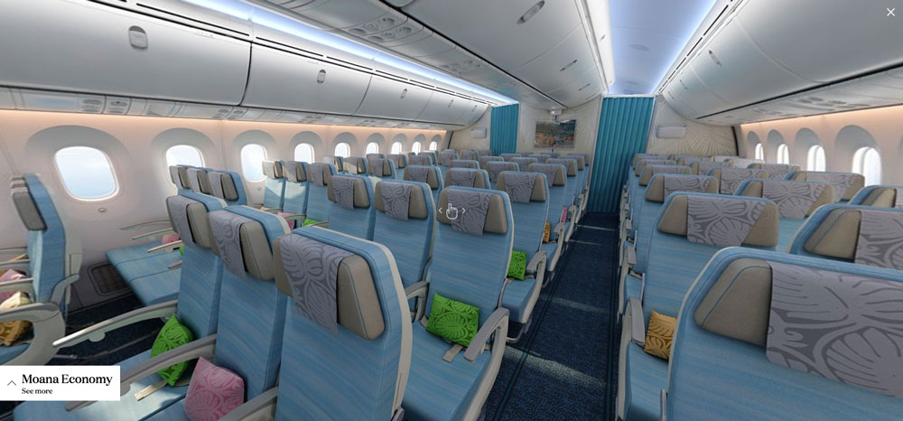 Moana Economy consisting of 232 seats in two cabins, in a 3-3-3 configuration and offering a pitch of 31 inches (78 centimetres) with a recline of 6 inches (15 centimetres).