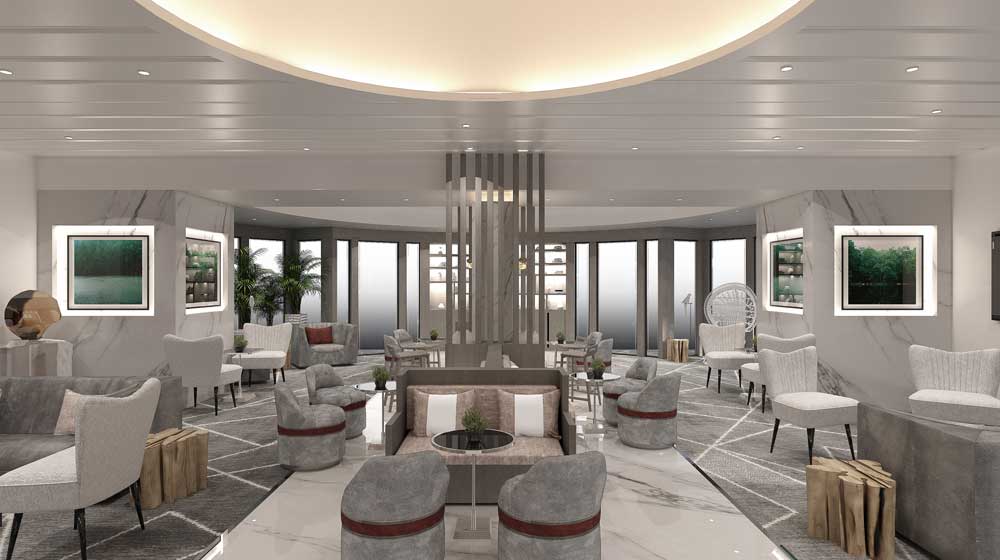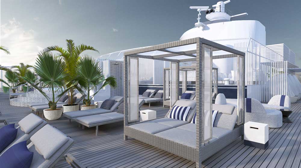 Every ship will offer The Retreat Sundeck and The Retreat Lounge, both designed by Hoppen. In imagining The Retreat Sundeck, she has created a chic, open-air hideaway with the feel of a high-end resort, where guests can unwind on plush loungers, sip cocktails and savour refreshing treats.