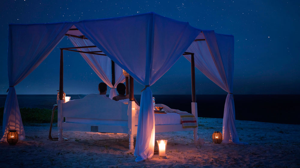 Arriving at Quissanga Island, couples are left alone to admire the sunset, toasted with pre-selected refreshments. As dusk gives way to a canopy of stars, the private beach is illuminated by flame-lit torches, lamps and flickering candles, setting the mood for a night of private romance.