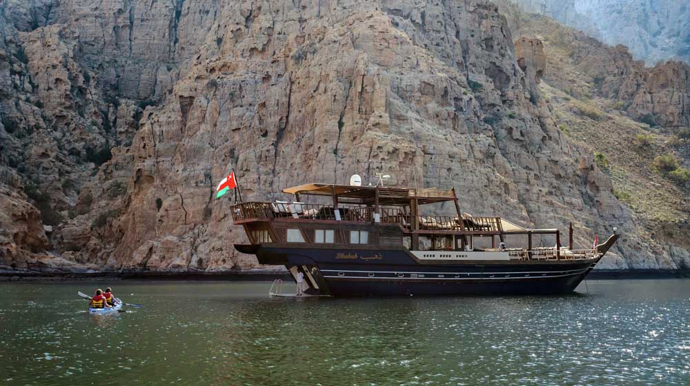 The Dhahab’s three-day itinerary starts with a cruise to Haffa and Sanat bays. On day one, the GEM (Guest Experience Maker) will recite ancient folklore tales while guests discover the myth of the dinosaur footprint. Leaving Sanat, the cruise continues along Lima Bay to anchor in Khor Kabahl for lunch where a leisurely afternoon is spent swimming, kayaking, snorkelling, fishing or taking a speedboat tour along the majestic fjords.