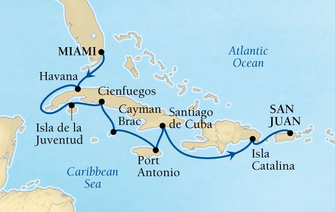 • 10 December 2019: 11-day Miami to San Juan, Puerto Rico, includes stops in Havana (La Habana), Cuba (overnight); Punta Frances, Isla de la Juventud, Cuba; Cienfuegos, Cuba; West End, Cayman Brac, Cayman Islands; Port Antonio, Jamaica; Santiago de Cuba (overnight); and Isla Catalina, Dominican Republic.