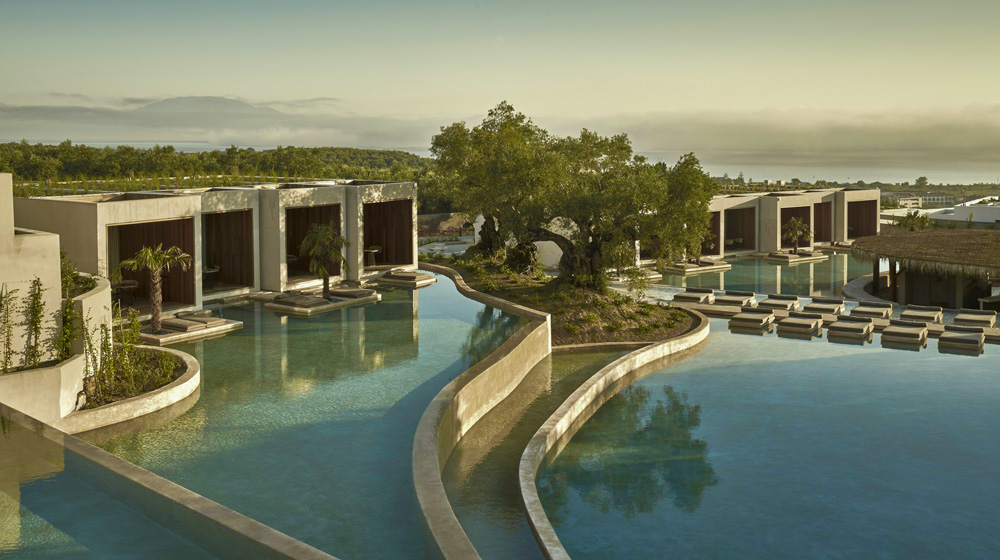 At the heart of the property is a 4,000-square-metre lake-like pool, which weaves and winds around Olea’s 93 suites, each of which takes a natural position on this internal creek.