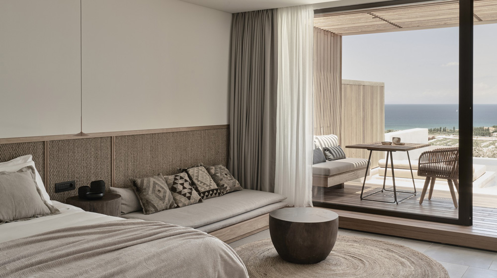 Blending the outdoors and indoors, the accommodations range from 36 square metres to 105 square metres and each features a terrace which overlooks either the Ionian Sea, the resort’s pool or the gardens.
