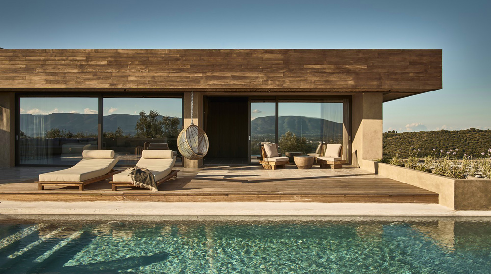 Perched on a hillside on the northeastern coast of the island, the property offers a unique vantage point from which to absorb this island’s natural beauty. The sea, countryside and sunset are all within view, framed by Olea’s luxe suites and communal areas, each defined by modern and elegant interiors.