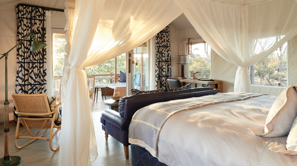 Belmond’s tented oasis, set beside the mysterious Savute Channel, will offer an exploratory base for guests in the heart of the national park. The newly designed interiors by Inge Moore of Muza Lab are visually calming, yet dramatic, filled with rich textures and colours, reflecting the earthy and dynamic surroundings.