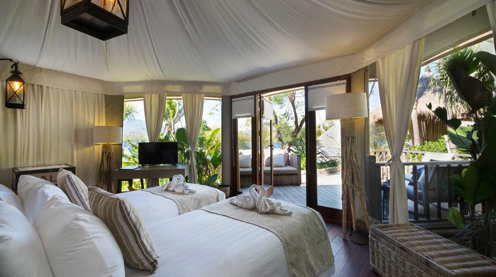 Accommodation at Menjangan Dynasty Resort comprises 24 Beach Camp Tents with a queen-sized or twin beds option, two one-bedroom Cliff Tent Villas and two two-bedroom Cliff Tent Villas, all created to the highest standards in South Africa from robust top-quality canvas. The cool air-conditioned interiors of the tents cleverly capture the ambience of the classic ‘safari club’ style with glass doors, natural materials and muted colours harmonised with blackened steel elements.