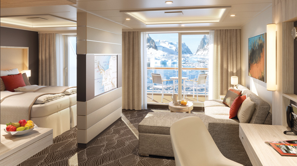 Elegantly imagined, with a sense of limitless space effortlessly incorporated into the design, the 13 extra-large balcony suites – each named for a famous polar explorer – impart a feeling of serenity. Palettes of warm creams, oatmeal and coral are complemented by soft textures, round corners, art that invites the eye to linger and Lindblad’s signature feather duvets; a walk-in wardrobe and roomy, stone-clad bath make each suite a haven.