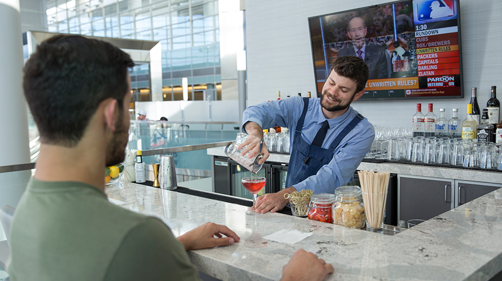 - The Replenish Zone that features comfortable seating and locally inspired selections from a chef-driven menu including a hot and cold buffet and a variety of all-day snack items. A fully stocked, expertly tended bar will offer complimentary cocktails featuring premium spirits.