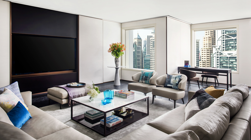 The Murray Suite #2301 is absolutely gorgeous, with 225 square metres of design by Foster+Partners’ Colin Ward and Armstrong Yakubu. The main salon is an S-shaped space with stone-coloured silk walls, and dark wood parquet flooring enlivened by a soft avocado rug under the main seating. The seating, which is soft avocado, includes a six-seat, L-shaped Ninotti leather sofa, with unique cushions in sit-up-and-notice colours.
