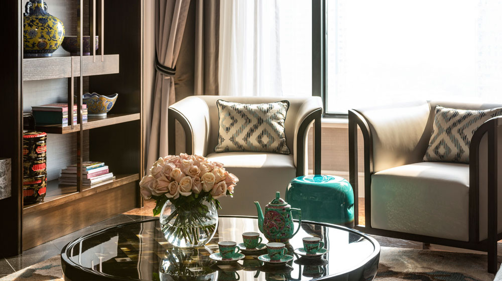 Four Seasons Hotel Singapore Governor Suite - Ambassador Suite: As colourful and rich as the intricate designs of the kamchen pottery featured in-suite, the Peranakan culture is a unique heritage that blossomed since the 15th century as a result of inter-marriages between the local Straits community with non-Straits descendants, when Singapore was a major trading port. This cultivated a beautiful cross-cultural appreciation in Singapore, evident through distinctive art styles, fashion, language and recipes. Accented with existing Straits Chinese elements through chic modern furniture in a turquoise, grey and dusty rose scheme, the Ambassador Suite is located on the 19th floor and exudes a unique grace and charm.