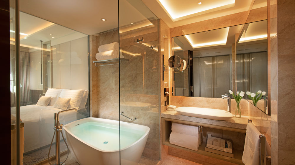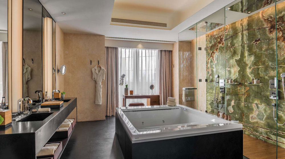 And boldness? Well, what used to be a sideways-on 30-step staircase leading from the lobby floor up to the next level is now a True Statement staircase, straight on as you go into the hotel. It is pretty bold, too, to take away the front desk. There are various small tables, and chic and immaculately groomed agents seem to appear by magic whenever one is needed. It is also bold to keep your main restaurant, Jiang, 30 steps down on a lower level – although there are escalators and elevators, and the excellent retail down there certainly helps. Reach Jiang through an elegant sitting area and then choose from a variety of niche ambiences, for more, or less, privacy. At breakfast a separate room is opened, for an enormous and superb buffet; you can see through to the kitchen, and talk directly to your egg chef.