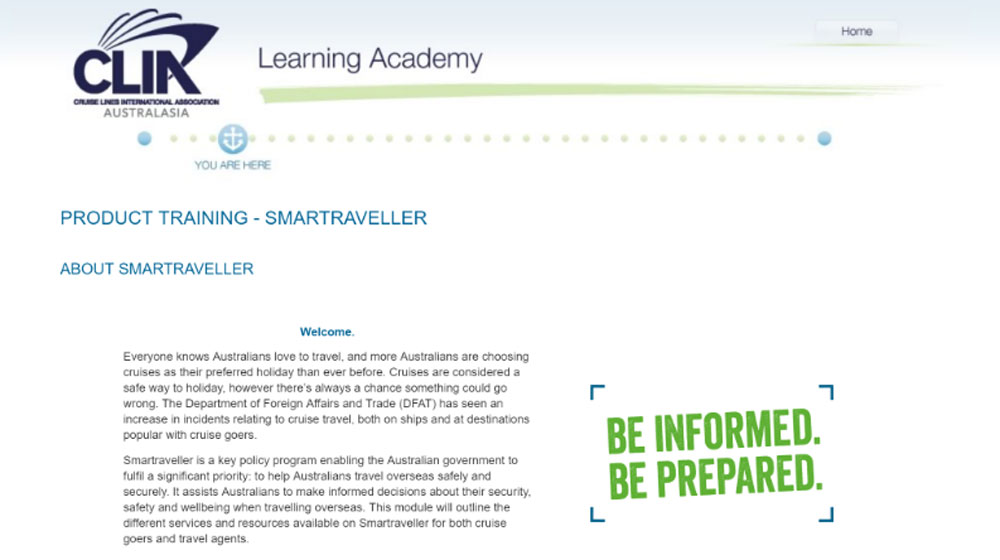 Smartraveller and CLIA have jointly developed a new e-learning module that helps CLIA travel agents learn how to get the most out of the tools, resources and advice available.