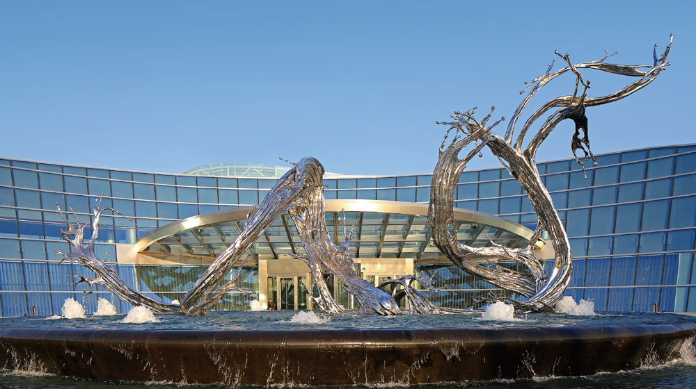 Guests can partake in extreme challenges such as rock climbing, kayaking and the property’s glass-floored skywalk. Evenings are lit up by a night-time laser and water-screen show.