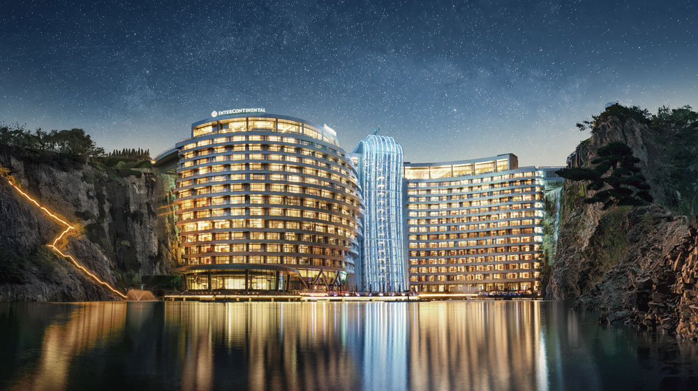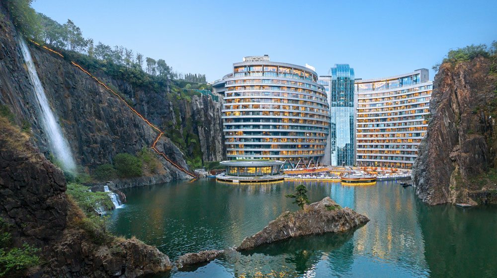 China is now home to one of the most unusual five-star hotels in the world following this week’s grand opening of the InterContinental Shanghai Wonderland. Located in the Sheshan Mountain Range in Southwestern Shanghai, the 336-room and -suite property has been built into the walls of an abandoned quarry.