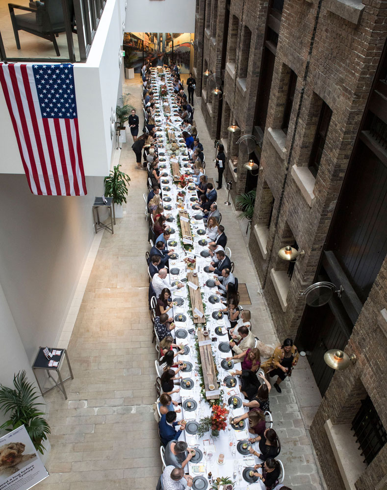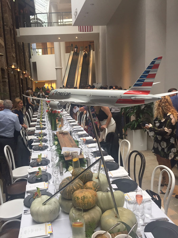 The table stretched the length of the venue, decked out with floral arrangements, shared platter platforms and scale model American Airlines aircraft as the centrepiece, some mounted atop pumpkins, with American flags draped throughout to set the Thanksgiving ambience.