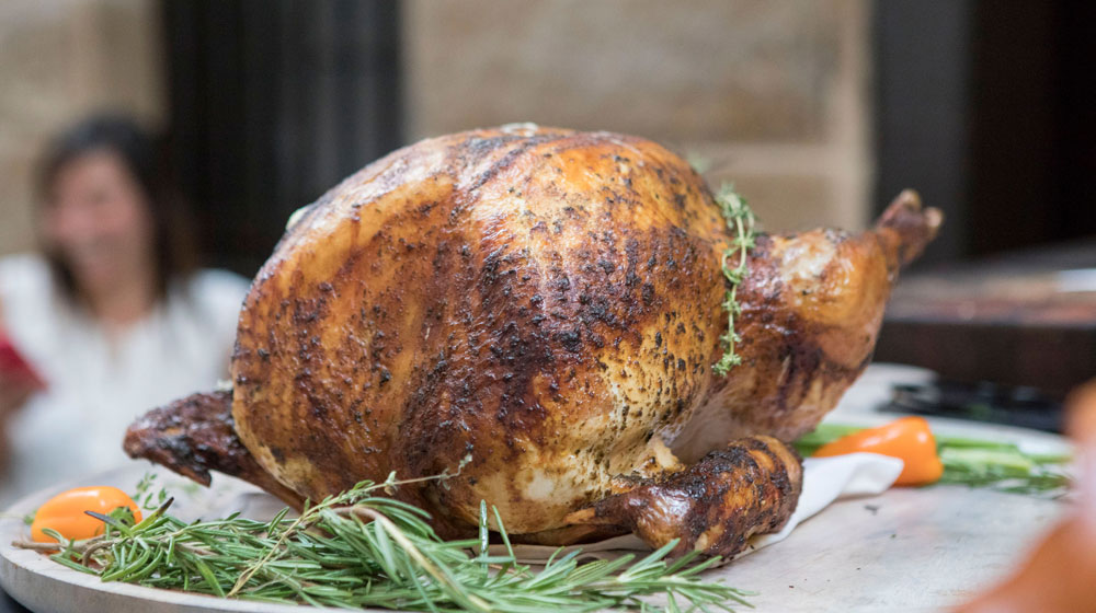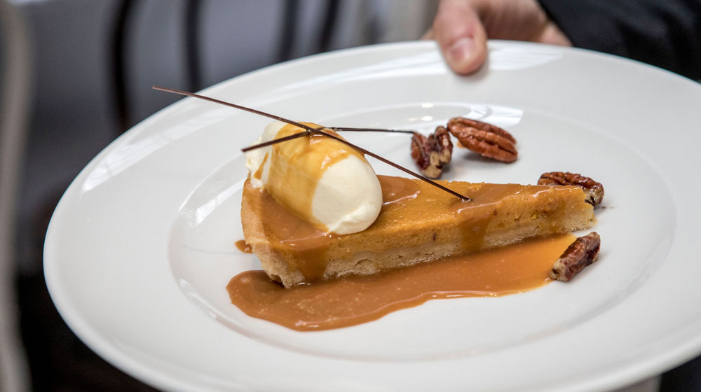 The menu at Hyatt Regency included a prawn cocktail in a Bloody Mary mayonnaise (entrée), Almond Grove turkey with chestnut stuffing and applesauce, accompanied by sides of duck fat roast potatoes, carrots and balsamic roasted Brussels sprout (main) and pumpkin pie, served with caramelised pecan syrup and chantilly cream.