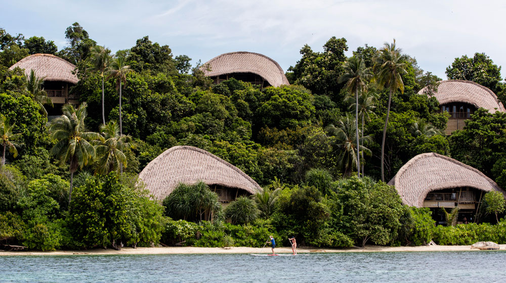 This bamboo resort nestles comfortably into its jungle island habitat offering guests beautifully appointed accommodation. Handcrafted from bamboo with ‘alang alang’ the Cogon grass roofs are designed to promote natural ventilation. The two-storey villas are over 150 square metres and incorporate a spacious upstairs bedroom, an ensuite bathroom and a balcony with glorious ocean views. Downstairs showcases a spacious lounge with an open-air deck area and a 1.3-metre-deep teardrop pool.