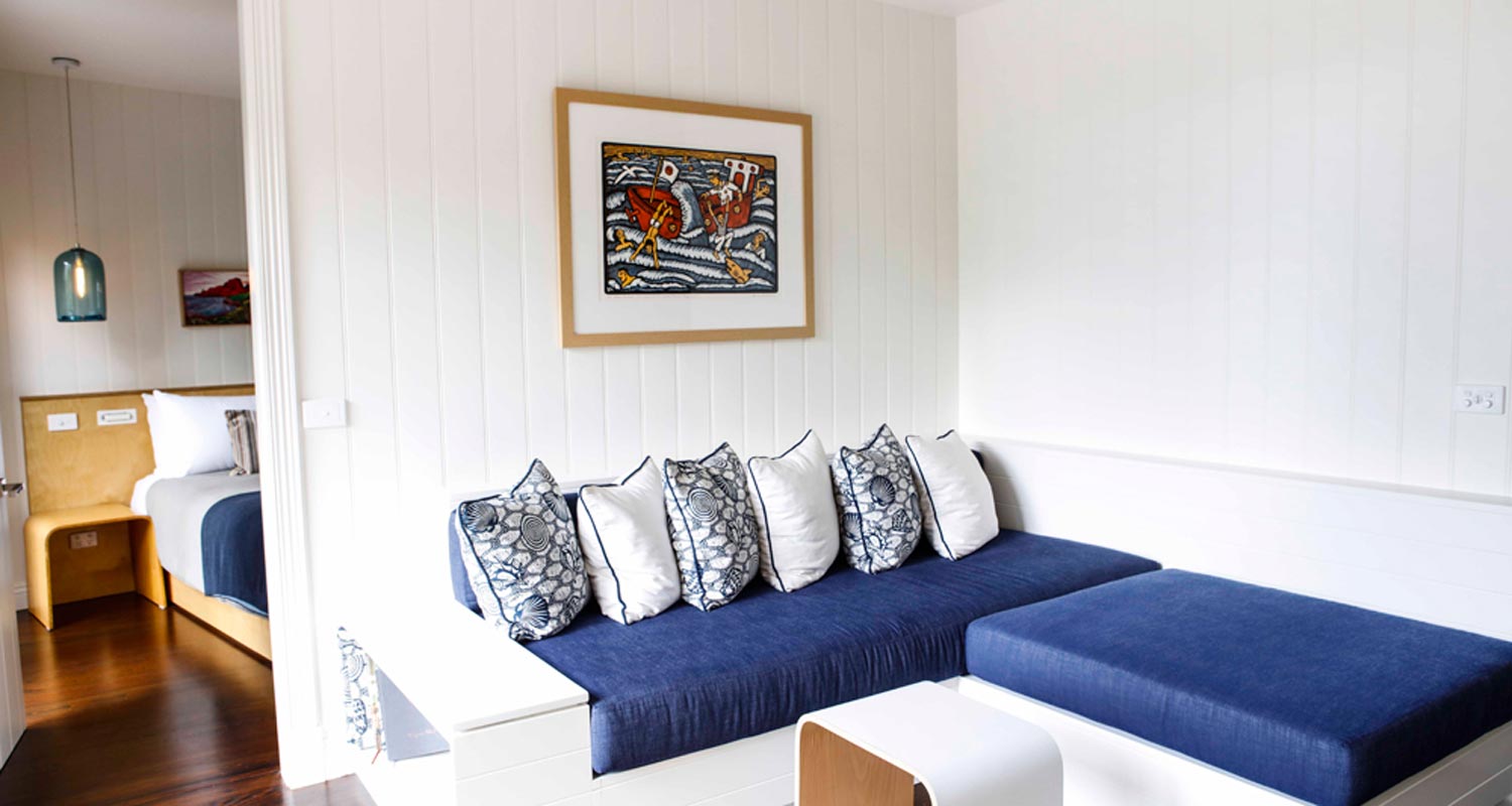 The Capella Spa has had an uplift to a loft level with views over the ocean and the lingering, late-afternoon sunset. Vintage Bruce Goold linocuts complement landscapes by local artist Ben Waters in the spa and guest lounge, while fabrics by Sarah Jordan reflect kentia palms swaying outside.