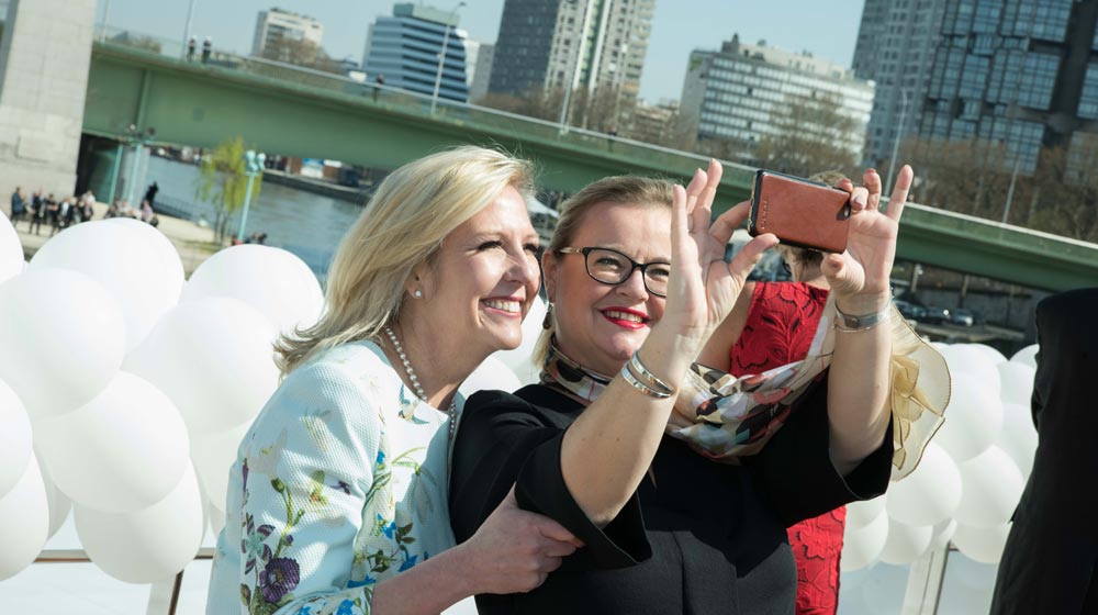 Uniworld Managing Director Australia, Fiona Dalton, capturing a selfie with Uniworld CEO Ellen Bettridge during the SS Joie De Vivre christening in 2017.