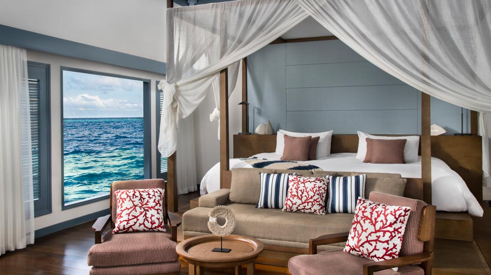 In each of the terraces, guests can marvel at the marine life below through the glass flooring panels. There is an extraordinary display of natural beauty with white, powdery sand that frames sparkling waters. Two magnificent reefs provide a thriving habitat for the marine life including baby sharks, turtles and a myriad of tropical fish.
