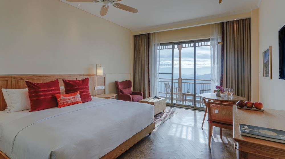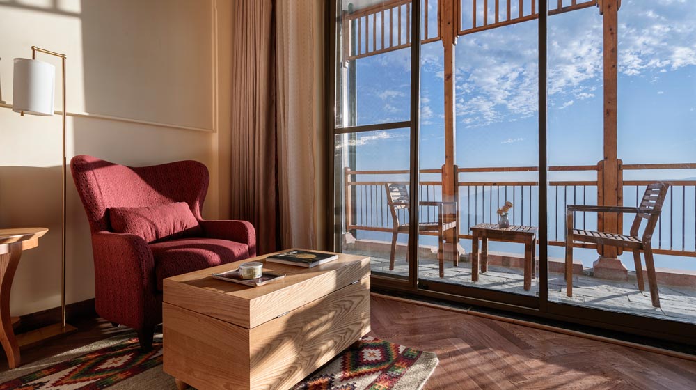 Taj Theog Resort & Spa is the first mountain resort for the brand, and its design and architecture echoes colonial charm reminiscent of hill station appeal. Surrounded by deodar forest, with pathways through apple orchards and terraced gardens, the resort is the quintessential luxurious home in the hills. Each of the 99 rooms, with warm wooden furniture, traditional rugs and tall French windows, offers spacious balconies overlooking snow peaks and quaint villages.