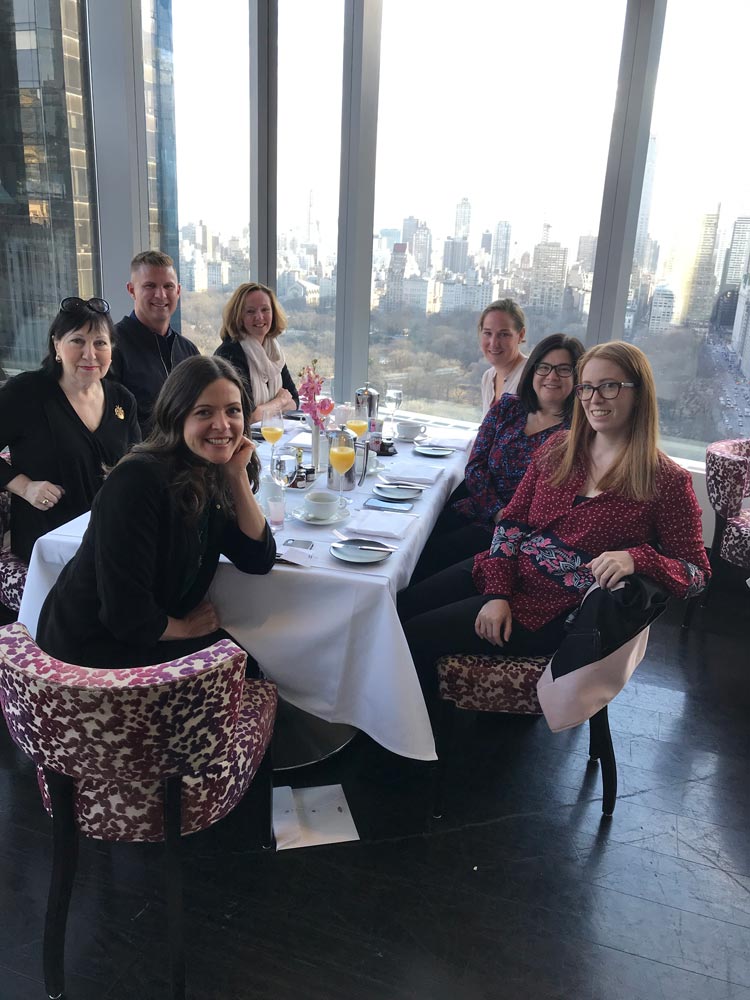 Breakfast at Mandarin Oriental (left right): Jodee Sorrell (Globetrotter), Philip Smethurst (Bicton Travel), Maggie Poynter (Spencer Travel), Skye Holyfield Anderson (Mandarin Oriental New York), Jessica Bennett-Griffiths (Wentworth Travel), Nikki Marlborough (Singapore Airlines), Kristin Hellmrich (NYC & Company)