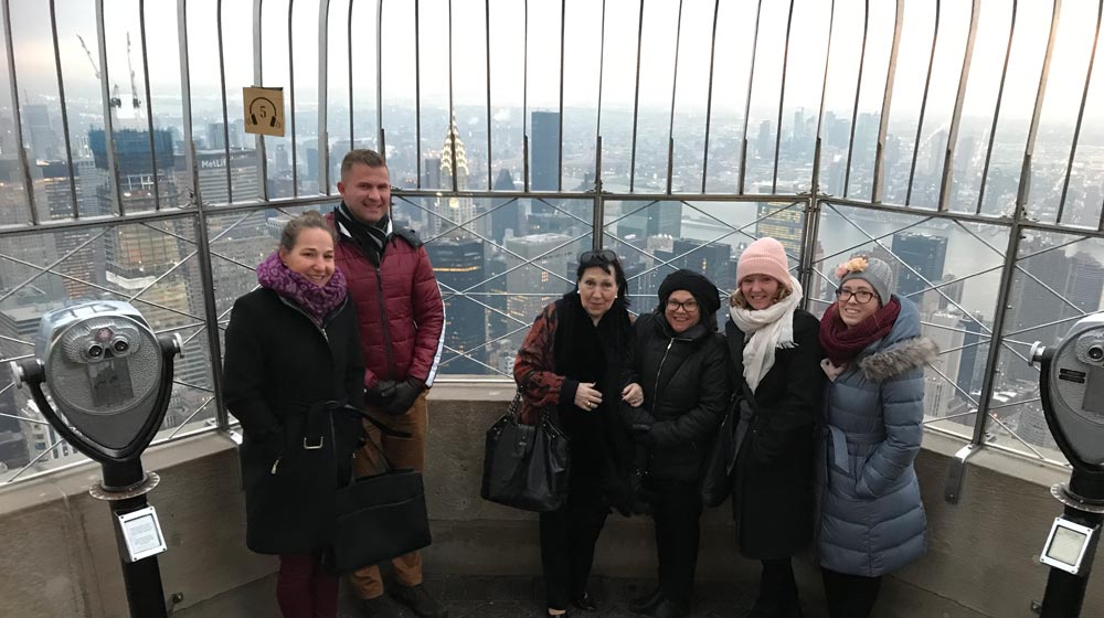 Atop the Empire State Building: Kristin Hellmrich (NYC & Company), Philip Smethurst (Bicton Travel), Maggie Poynter (Spencer Travel), Nikki Marlborough (Singapore Airlines), Jodee Sorrell (Globetrotter) and Jessica Bennett-Griffiths (Wentworth Travel)