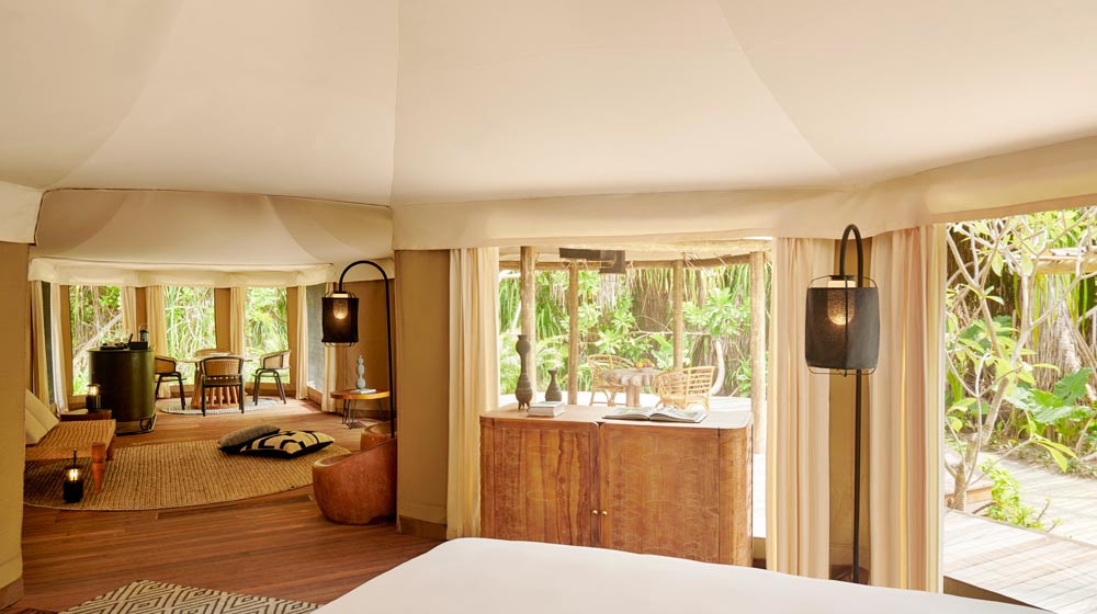 Set in their own private wilderness, the Tented Jungle Villas are built to mirror the beauty and diversity of the island’s verdant flora and fauna. Built with wooden frames, amber-toned interiors and walls swathed in white canvas, travellers have the opportunity to get closer to nature. A harmonious balance of space and seclusion, the Tented Jungle Villas house a master suite with Californian king-sized bed and ensuite bathroom, a spacious al fresco lounge complete with handmade wooden furnishings, and a Sala for communal dining that overlooks the private pool and outdoor bathtub.