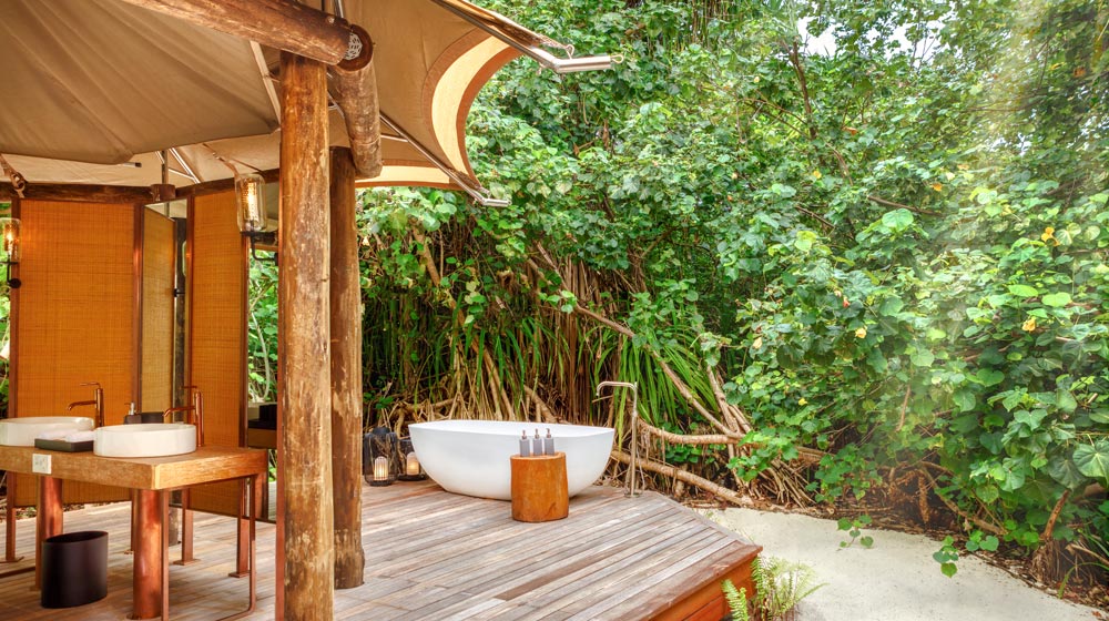 A unique alternative to overwater accommodation, the Tented Jungle Villas house an outdoor rain shower, roll-top tub and locally sourced, rustic interiors.