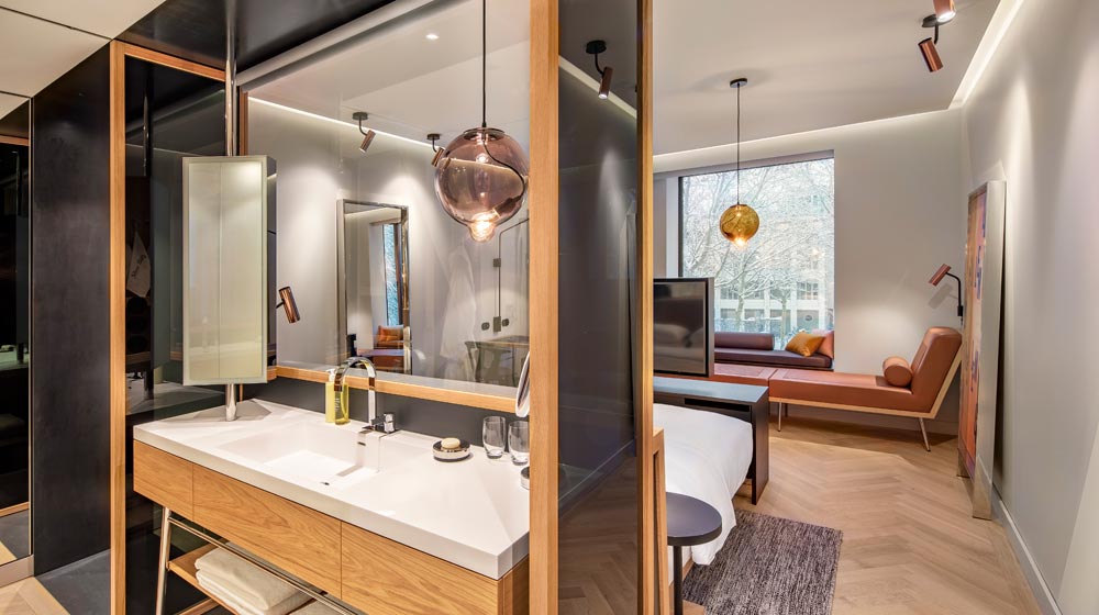 Just as Munich combines new and old traditions, the interior design of Andaz Munich Schwabinger Tor weaves in the heart and soul of the city. Guests can take in a video installation by artist Yves Petzner in the lobby; stone and herringbone oak floors, luminous diamond-patterned ceilings, copper accents and leather sofas all come together to emphasise the design style of Munich.