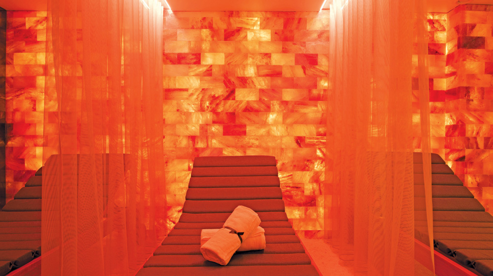 The humidity- and temperature-controlled rooms are handcrafted from salt bricks and recreate the micro-climate of a natural salt mine. The three inclined lounging chairs are separated by light curtains for privacy, and low-level lighting and calming music promotes the natural relaxing effects of the salt.