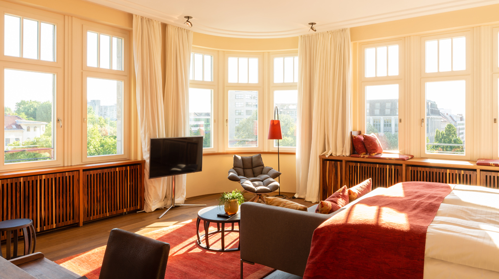 After dinner, Dirk Dreyer kindly drove me to my one-night home. I was staying at Orania.Berlin Hotel. This elegant five-floor building started life in 1914 as a café and today’s Managing Partner, who also did all the design, is an entrepreneur called Dietmar Mueller-Elmau, who, along the way invented the Fidelio software, which he sold on to Opera. The building is L-shaped. The ground floor has 3.6-metre-high windows looking out into Leuschnerdamm and Oranienstrasse and Oranienplatz, and an L-shaped bar with 15 leather-seated chairs with backs, right round to the one restaurant, run by GM Jennifer Vogel’s husband, Philipp Vogel. Once again, the hotel, which has 41 rooms, sees all 60 restaurant seats full at lunch and dinner.