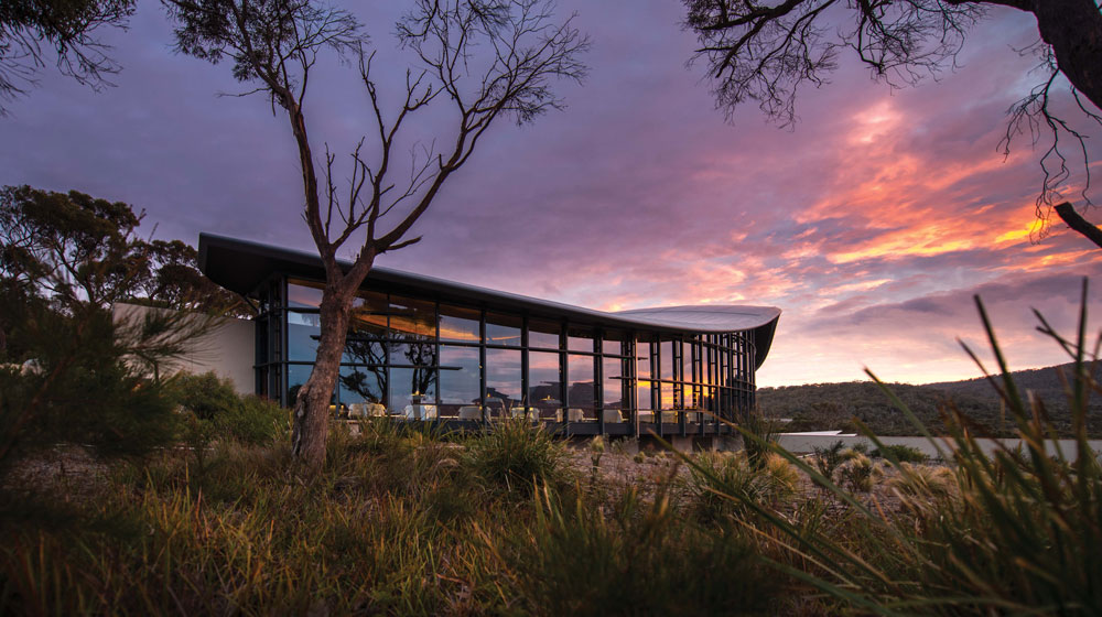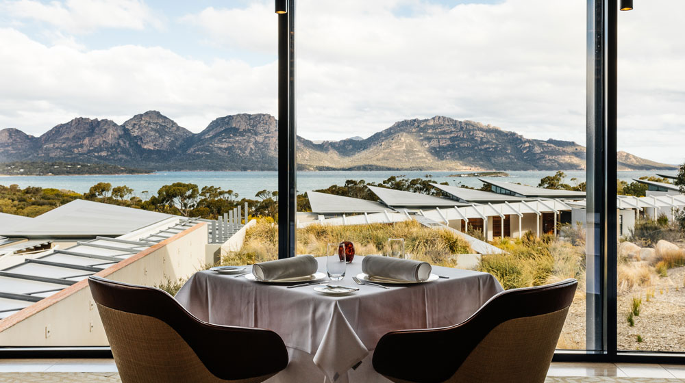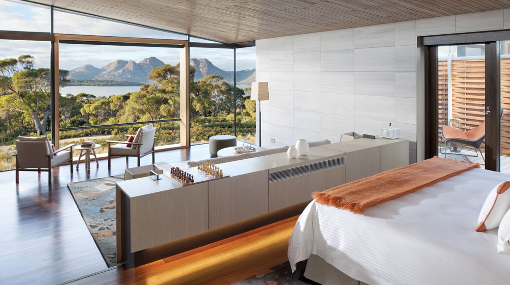 Well, I knew I was in for a treat at Saffire Freycinet but I did not realise it was ‘wow’ from the moment of arrival. Although it can only be properly seen from above, the main block is shaped like a giant stingray, with 20 detached villas beyond its head. These villas all face across Oyster Bay to a promontory with a skyline of the five Hazard mountains, the tallest of which, in the middle, is the 485-metre-high Mount Dove. How did this resort, which opened 2010, come about? I am told that the Farrell family’s Federal Group wanted to extend their Tasmania gaming monopoly and to achieve this they had to build a resort. Fortunately, they happened to have a caravan park in Freycinet National Park that they were prepared to sacrifice.