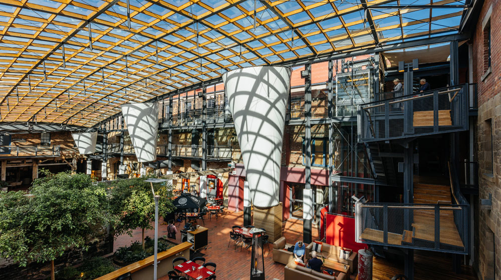 Complementing the art is the building itself, a conversion of the jam factory started in 1869 by George Peacock. He later sold the operation to Henry Jones, who began his own career at the age of 12 by sticking labels on jam tins. Jones worked his way up and made Henry Jones IXL Jams into a global phenomenon. The Federal Group bought the dilapidated three-floor buildings, structured in a C-formation around a central courtyard, which has now been glassed over to create an expansive conservatory. In the main arrival lobby, there are two artworks, specially commissioned and completed with kids’ crayons; one shows a basket for holding jam fruits, the other an urn used in the preserve-making process.