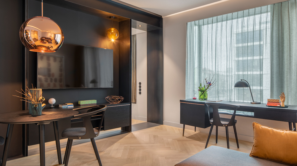 As an alternative to city-centre attractions and historical tradition, Munich opened its first new luxury hotel in 11 years on 25 February 2019. Andaz Munich Schwabinger Tor is a 274-room property that is part of a new community, the village of Schwabinger Tor conceived and overseen by realtor Maximilian Hurler and his family. There are four separate blocks, two – joined by a fifth-floor air bridge – for the hotel, one for offices and one that holds 150 apartments (for rent, rather than sale, to ensure the Hurlers retain control of them). In between the buildings are roads for pedestrians, for cycling, running and walking and for farmers’ markets to offer their wares.
