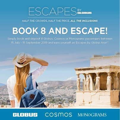 Terms and conditions: Escapes by Globus Giveaway is for AU selling consultants and applies to new 2019/2020 eligible bookings (including groups) made and deposited between 15 July to 15 September 2019. All deposits must be received by 15 September 2019 to qualify. Book & deposit eight 2019/2020 Globus, Cosmos or Monograms passengers and receive one free European Escapes by Globus tour (2019/2020 only). Escapes by Globus booking incentive cannot be combined with any other current incentive. Free European Escapes by Globus tour can only be redeemed once and is for the selected travel agent only and their travel companion sharing based on twin share, is non-transferable and not redeemable for cash. The winning agent must be an active selling agent at the time of travel. It is the responsibility of the winning agent to book and redeem their European Escapes by Globus tour by 31 December 2019. Additional costs including (but not limited to) flights, extensions, accommodation, transfers, taxes/fees, travel insurance, excursions and meals are the sole responsibility of the winner(s). This incentive can be withdrawn or amended at any time without notice. Globus family of brands’ decision is final and no correspondence will be entered into. For all enquiries please email sales@globus.com.au
