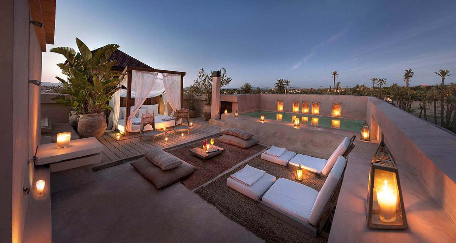 Set in 4 hectares of Persian-style gardens, Ksar Char Bagh is a private palace inspired by 14th-century Moorish architecture and 21st-century minimalism. Located in the palm-groved outskirts of Marrakech with gardens filled with birdsong and criss-crossing streams symbolising the rivers of paradise, it is an Arabian Nights dream come true. This is where the rich and famous come to luxuriate in the tranquility, seduced by its great sense of intimacy and privacy. Behind the magnificent seven-square-metre brass doors, high arches with mosaic carvings of Andalusian descent and a huge vaulted red marble hamman, palatial apartments come with either a terrace or private garden and every single object, piece of furniture and furnishing has been designed by the owners.