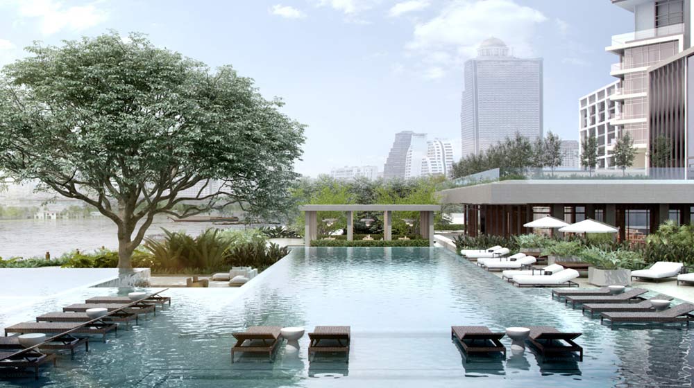 Set along 200 metres of uncluttered riverfront, architect and designer Jean-Michel Gathy has conceived a fresh landscape that integrates successive indoor and outdoor spaces through a series of cascading buildings, courtyards, terraces and water features across 3.6 hectares along Charoenkrung Road.